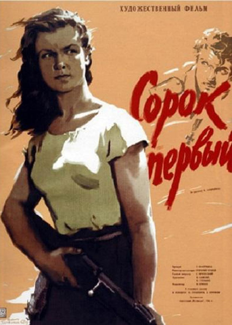 浪涛拍打着海岸,一支红军的幸存部队从里海岸边向卡拉库姆大沙漠撤退。从死亡的包围圈里冲出重围的有23名战士和政委叶夫秀柯夫。他们中有一名女战士——玛留特卡,她是神枪手,弹无虚发,她的死亡簿上已经有40个白军了。一天夜里,他们架起了篝火,正躺下宿营的时候,忽然听到骆驼队的蹄声自远而近,玛密特卡叫醒了政委。政委命令大家从四面围上去,不得把骆驼打死。他们和骆驼队的哥萨克兵交火激战,一个白匪军官躲在骆驼后面朝他们射击,玛留特卡放了一枪,满以为准能打死这“第四十一”个,谁知未中。那军官从骆驼后面伸出一把挂着白手帕的刺刀,成了这支红军部队的俘虏。白匪的这些骆驼是由吉尔吉斯村民牵来的,那个吉尔吉斯老头把骆驼牵回,政委征用了其中的一半。红军战士们从白匪中尉身上嵌着的一个暗兜里搜出一份文件,文件证明这个军官姓戈沃鲁哈一奥特洛克,是个近卫军中尉,他被高尔察克海军上将委派为驻邓尼金的里海东部政府全权代表,他负有秘密使命,要向德拉琴柯白匪将军面陈。政委试图让其招出秘密使命,但他缄口不言。政委决定把他押到司令部去审问。政委把看管这个重要人犯的任务交给了冯留特卡。玛留特卡发现这个俘虏的眼睛澄蓝澄蓝的,和海水一样的蓝,她几乎都不敢看他的眼睛,这双眼睛撩得她心慌意乱的。但她立即记起了自己的任务是严加看管,于是便用骆驼级绳捆绑他的双手,连睡觉也不给松绑。当天夜里,那个吉尔吉斯村民乘哨兵丘皮尔柯失职睡着的时候,把骆驼悉数牵走,还杀死了看管骆驼的战士马满库尔。风雪交加,这支幸存的红军部队在沙丘上走着。只剩下11个人了,其余的战士在这艰险的路程上已一个个倒下。只有一小锅水了,他们传递着一人喝一口。行进的队伍排成单行在盐碱地上走着。一个人倒了下去,战士们忙拥上去抬他,画面上立即化出一个坟堆,坟顶上插着用盐木枯枝做成的十字架。战士们艰辛地走过了大沙漠,沿着阿拉尔海岸走去,他们来到一个吉尔吉斯村落。村民们招待他们饱餐一顿抓饭。吉尔吉斯姑娘阿尔腾挪对白匪中尉仅剩下的一个肩章发生了兴趣,玛留特卡伸手扯下中尉的肩章给了她。吉尔吉斯帐篷里烧着火盆,战士们都睡了,马密特松在阿尔腾娜给她的一张纸上写诗。中尉好奇地想听听她写的诗。玛留特卡念了一段,诗中描绘红军如何同哥萨克作战。中尉称赞她“感情丰富”,建议她以后好好学习,冯日特卡盼望能进学校学习作诗。她突然关切地问中尉:被捆绑着的手是否很痛?她让中尉起誓决不逃跑之后,替他松了绑。红军战士离开了吉尔吉斯村庄继续上路,他们在海岸上发现一条被大风吹来的渔船。政委让战士们把船修好,决定派玛留特卡与两名战士押着中尉从海路出发去司令部,自己带领其他人沿海岸步行前进,以便沿途招募新兵。他嘱咐玛留特卡不得让这个俘虏逃走,否则以军法论处,如遇到白党,不能把活人留给他们。渔船出发了,中尉拿着胶,他过去有私人游艇,其他的人还真不会驾船!玛留特卡里着海水,又望望中尉的眼睛,不禁叹道:“天啊!你的眼睛蓝得跟海水一样!”海上起风了,乌云遮天,疾风阵阵,巨浪把两个男战士卷入海中,海水灌进了船舱。中尉吓得划十字,浪涛抛掷着小船,船被冲到了一个孤岛上,均留特卡和中尉着陆了。他们走到一个板房鱼仓里,设法点上了火,用鱼作燃料,坐在火旁烤供湿衣服。中尉冻病了,说起了呓语