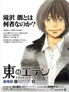 《东之伊甸》(日语:东のエデン)是2009年4月于日本富士电视台的noitaminA播放的电视动画。是导演神山健治的原创作品,亦为noitaminA的第一部原创故事动画。电视播放结束后,后续的剧场版I The King of Eden及剧场版II 。原创剧情与高质量制作完美融合使曲折离奇的故事更加引人入胜,担任人设的羽海野千佳和负责配乐的川井宪次都堪称是豪华阵容的必要成员。而且片头曲更选中了英国摇滚乐团的头把交椅Oasis(绿洲乐队)的热卖名曲,如此的大手笔使影片具有很强的商业价值。